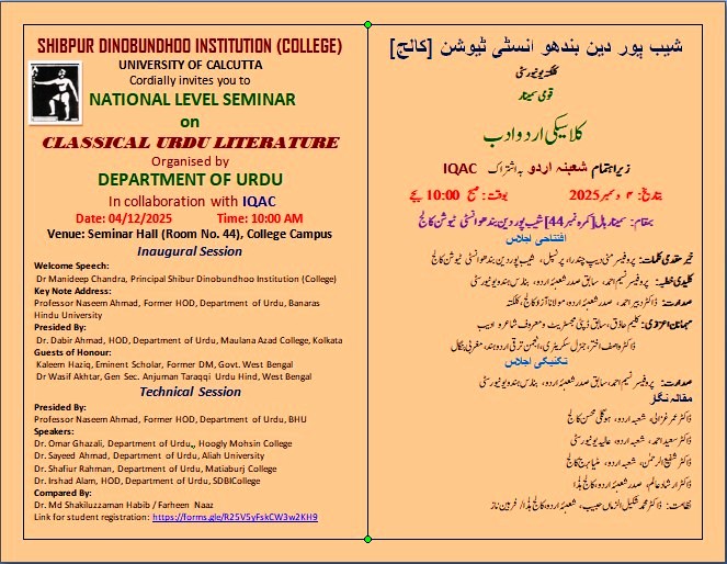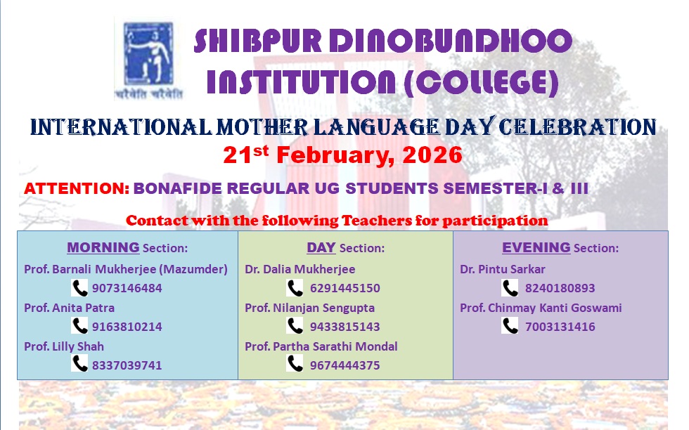 Shibpur Dinobundhoo Institution (College) is one of the pioneer colleges embracing a vast hinterland of urban and semi-urban areas of Howrah District. Established in 1948, the college has consolidated its position as one of the leading institutions of the district, imparting undergraduate learning in diverse areas of Humanities, Social Sciences, Bio and Pure Sciences and Commerce.
